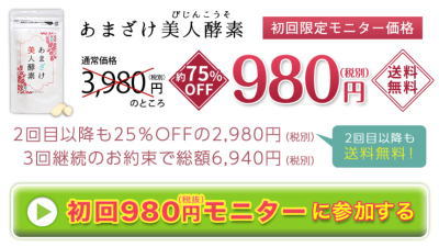 初めてあまざけ美人酵素を試してみようという方は、初回限定モニター価格の980円で試すことができます。しかも送料無料ですし、30日間の全額返金保証付きなので気軽に試すことができます。